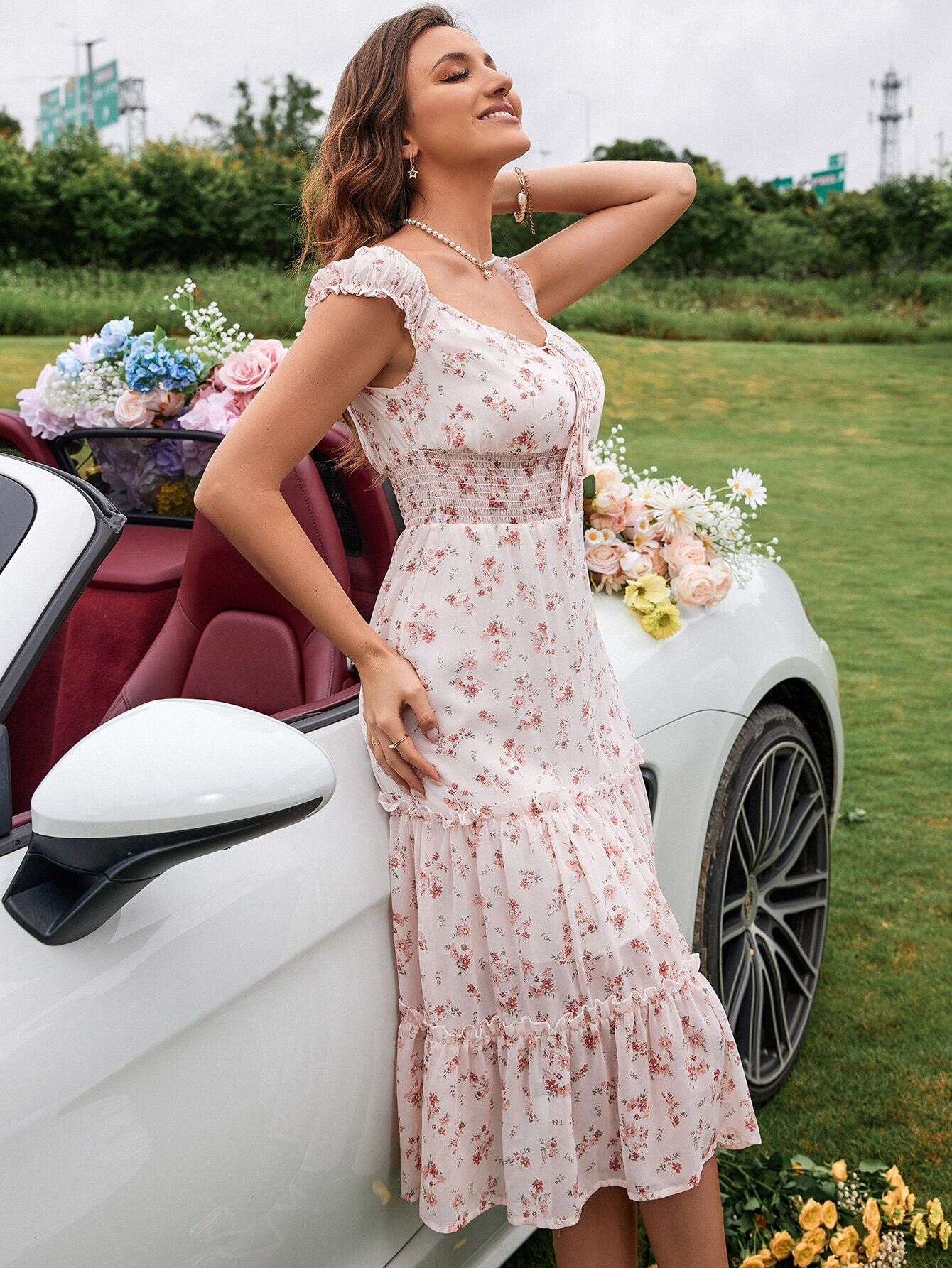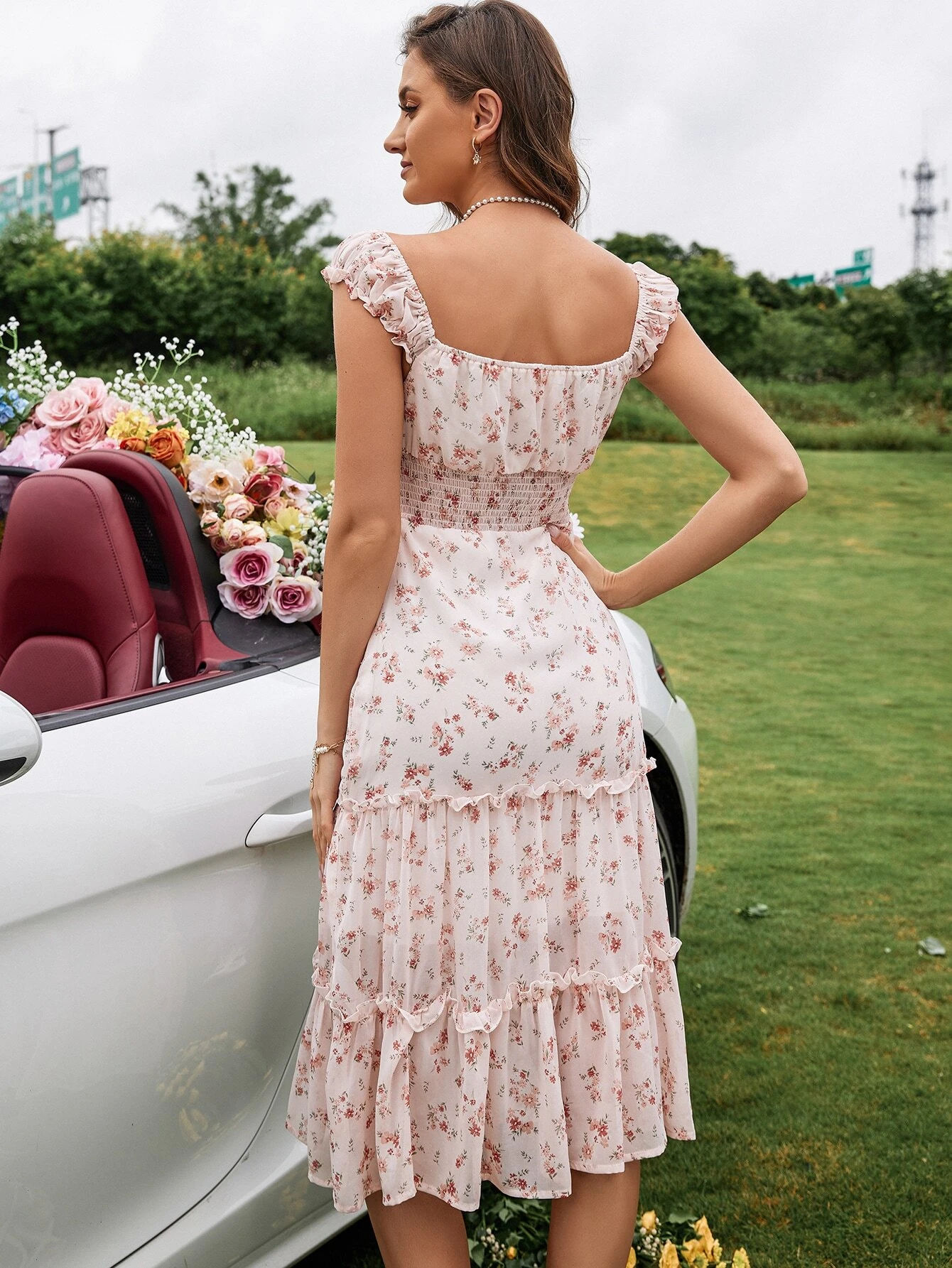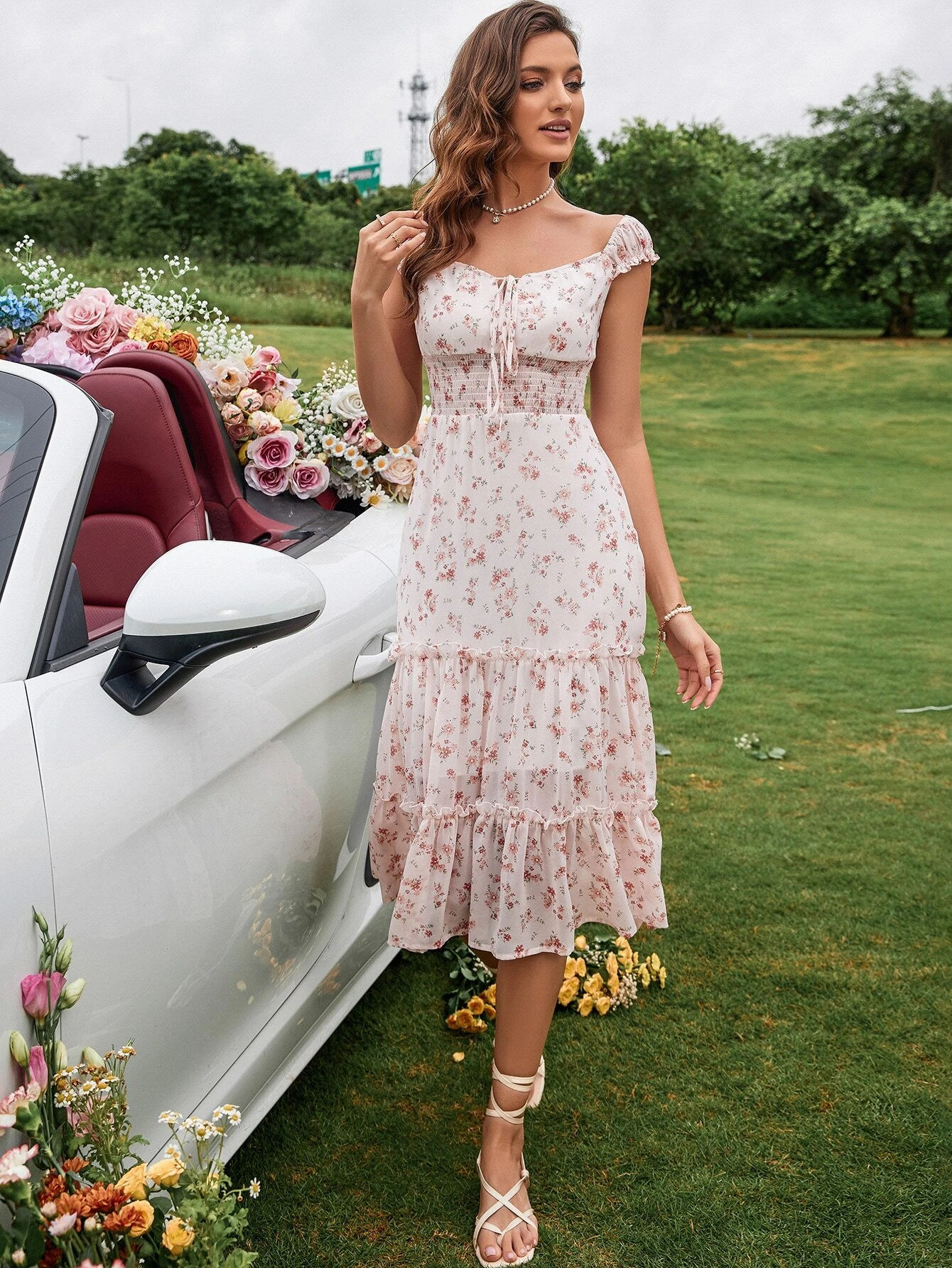 Flower Printed Women Shirring Dress Random Floral Print Shirred Waist Knot Front Ruffle Hem Dress