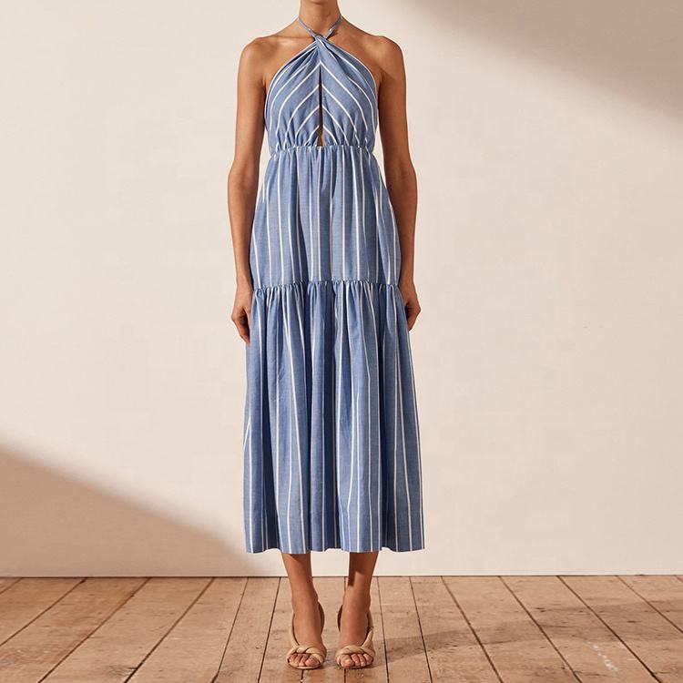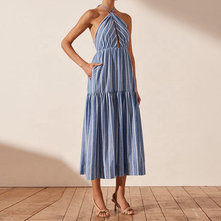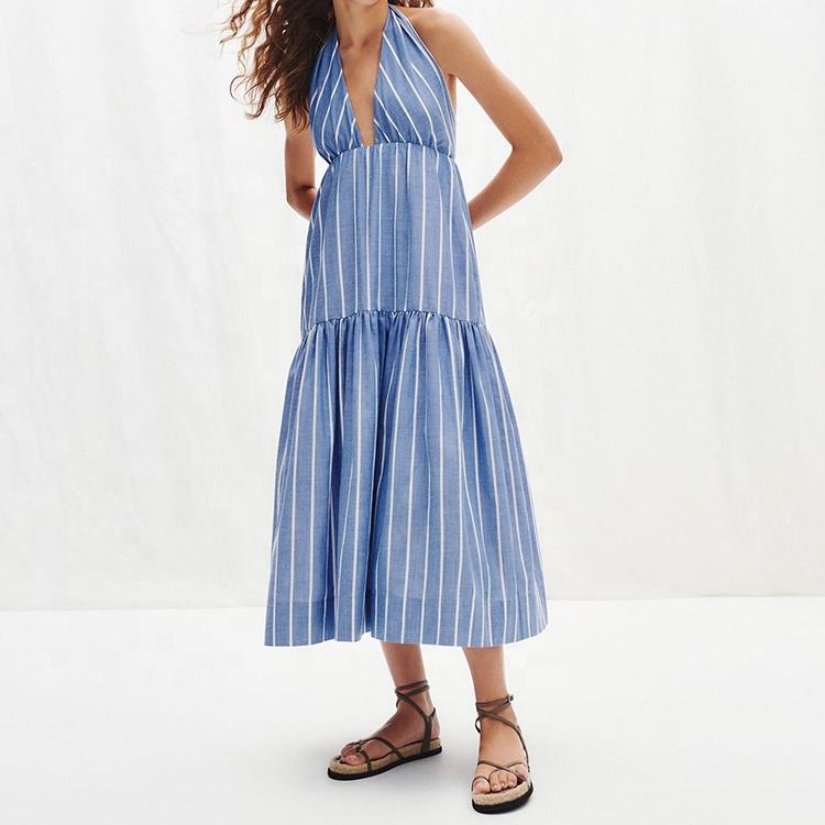 OEM Custom High Quality Ladies Linen Long Dress Elegant Deep V-neck Stripe Halter Sleeveless Midi Casual Dress for Women